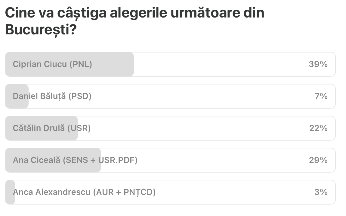 Altfel, urmează campania electorală și o să auziți multe opinii. Inclusiv din partea mea. Dar ca să răspund și eu la sondajul de mai sus: cred că bătălia se dă între Ciucu și Băluță. Au bazinul cel mai mare și partidele care îi pot ajuta (cu toate că în ambele cazuri se vede cu ochiul liber o mobilizare mult mai mică la nivel de partid față de alți ani). Nu am încă multe opinii despre Drulă (aștept să mai citesc - tot ce știu e că nu am să-l votez), iar Alexandrescu mi se pare că poate lua din electoratul lui Băluță și că ar putea dinamita atmosfera din AUR cu un rezultat bun (un contracandidat pentru poziția lui Simion)👀