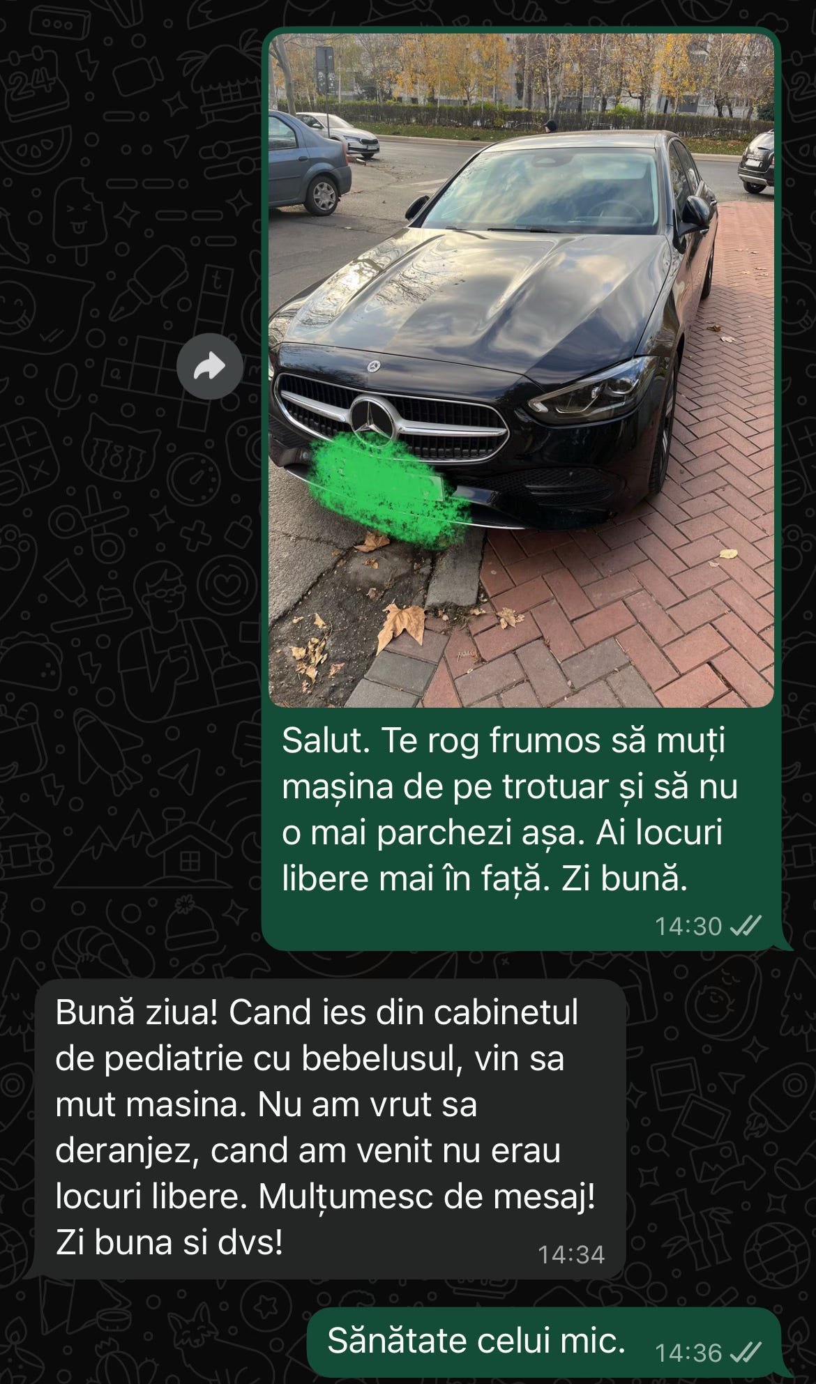 Când vine vorba de parcat aiurea am un sport preferat. Le dau mesaje celor care parchează aiurea, dar totuși lasă un număr în geam. Inițial abordasem o tactică mai nervoasă, ceea ce n-a ajutat. De ceva timp încerc să fiu politicos. Merge mai bine. Și dacă ei sunt nervoși (se mai întâmplă) eu plusez cu și mai multă politețe. Și tot așa. Într-un final ori o mută, ori chem Poliția. Vă sugerez să faceți același lucru🚔